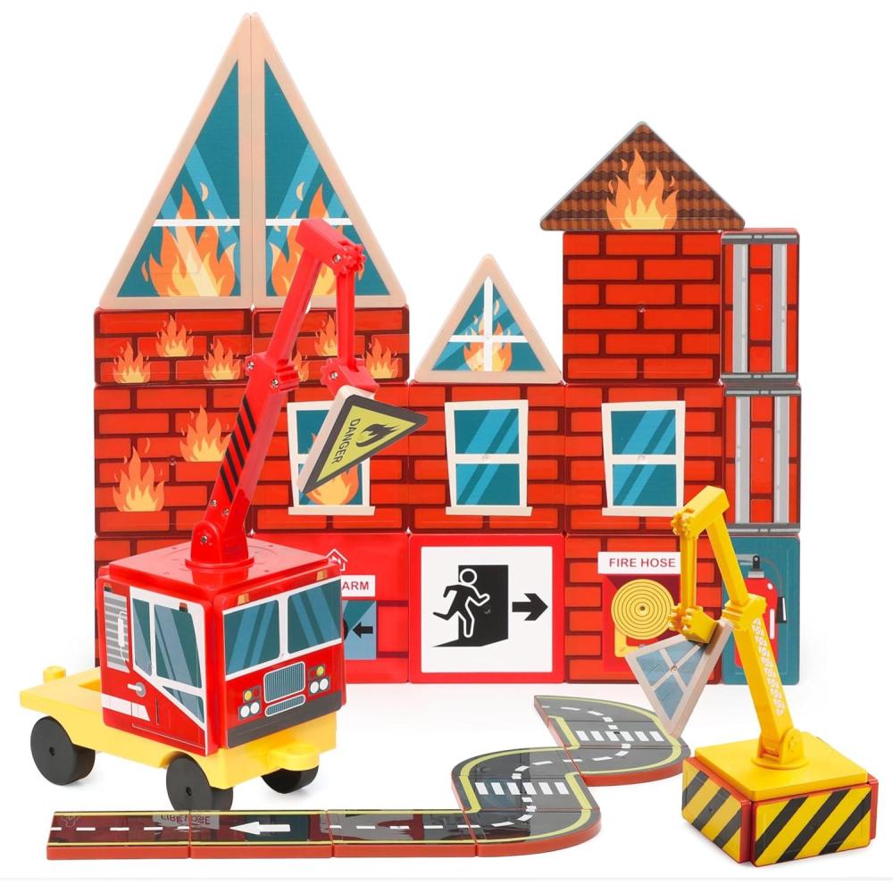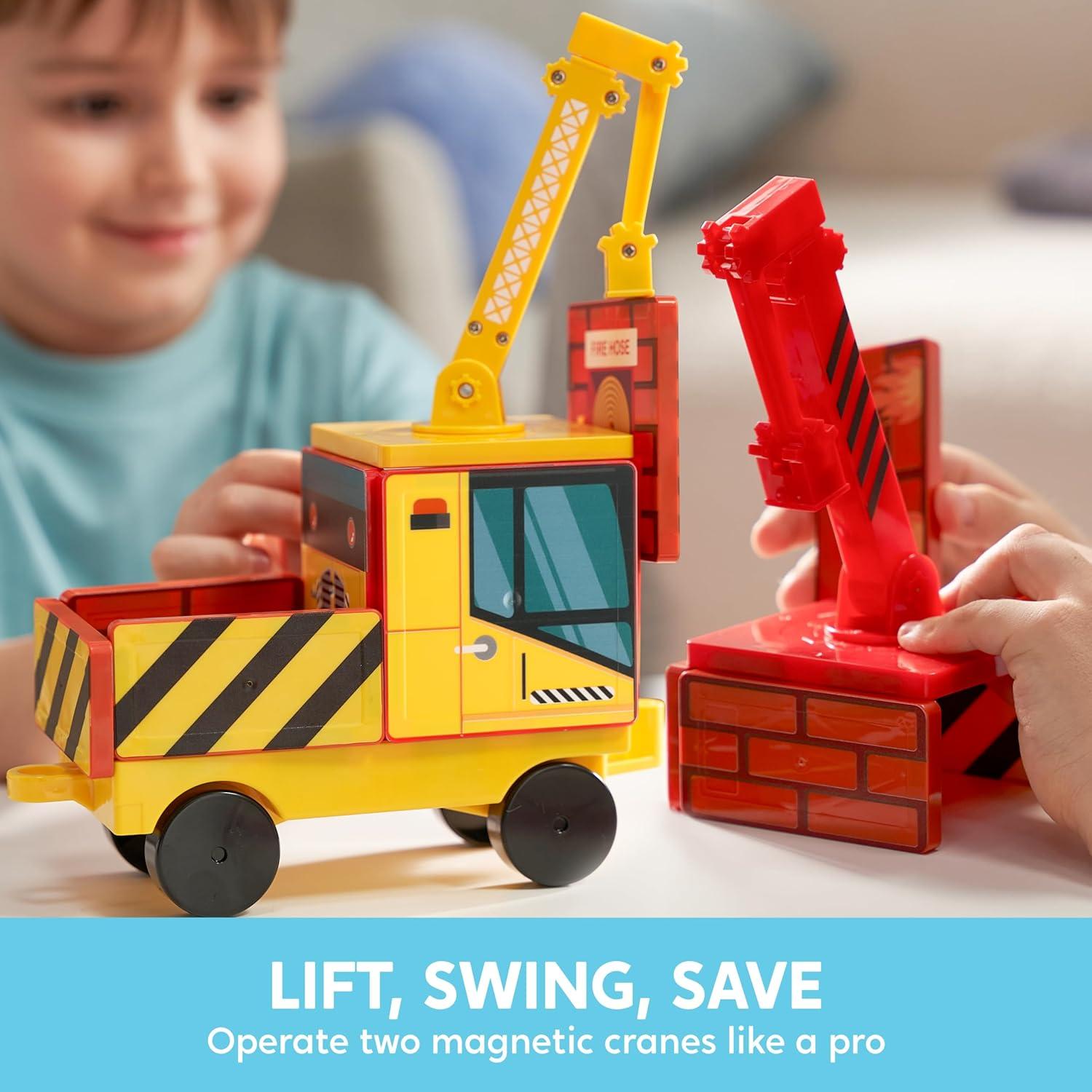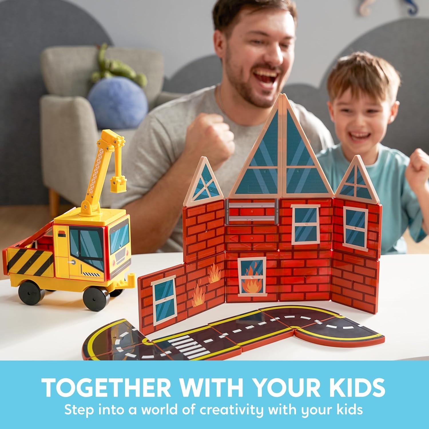 Trusted Quality: Made from ABS material with stronger magnets. The set includes cranes, construction vehicles, fire trucks, roads, fire and traffic signs, fences, and more. The crane magnetic building tiles can rotate and extend, providing highly interactive play.
