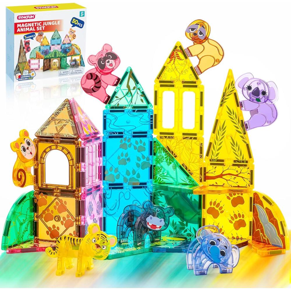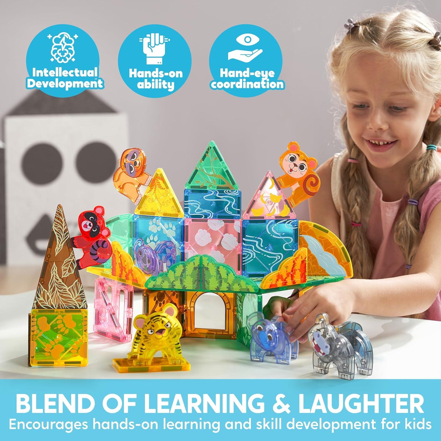 Rich Accessories: Includes 50 pieces, featuring T-Rex, Spinosaurus, Triceratops, Stegosaurus, and Brachiosaurus. The diverse magnetic building tiles and dinosaur figures inspire kids' imaginations, allowing them to create and customize various dinosaur landscapes.